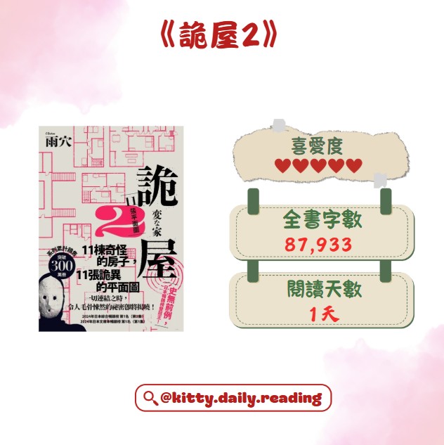 雨穴的小說,我很喜歡《詭畫》,但不怎麼喜歡《詭屋》,所以《詭屋2》出版時猶豫著要不要看,結果看到許多好評,便將書買下來。